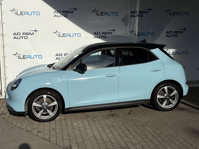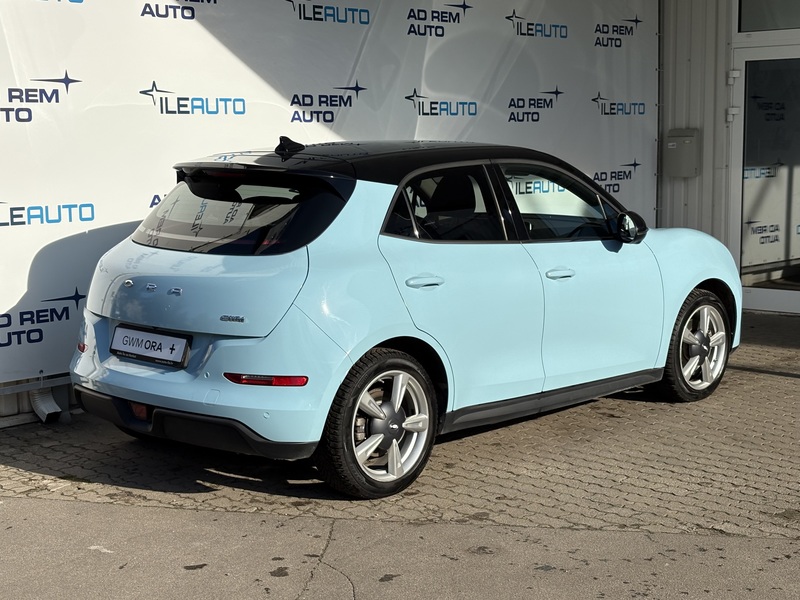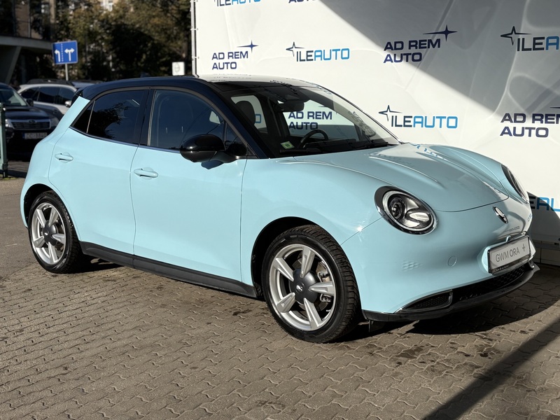 Oficiālais Gwm ORA pārstāvis ''Ile Auto'' piedāvā iegādāties jaunu ''ORA+ Plus'' elektroautomašīnu zilā krāsā ar melnu jumtu;